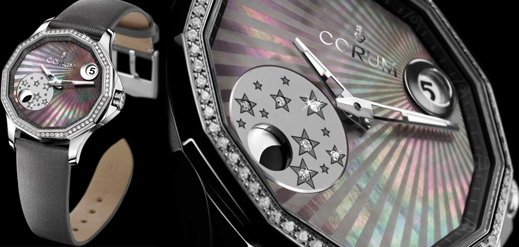 La particolarità assoluta di questo segnatempo è il quadrante mobile che scorre al di sotto delle lancette, lasciando apparire, attraverso un perfetto gioco di vuoti e pieni traforati ed abilmente smussati, sia il datario che la strabiliante fase lunare semovente. Il quadrante in madreperla inciso a raggiera, è quindi libero di ruotare e il movimento consente di far apparire il giorno del mese e la fase lunare, ogni volta in un punto diverso dell’orologio; questo particolare meccanismo è semplicemente regolabile attraverso la corona con incisa la tipica chiave, segno distintivo della casa. Molto particolare la porzione dedicata alle fasi lunari, tempestata di stelle e diamanti con una delicatissima luna in madreperla nera sottostante. Il tutto viene incastonato nel classico quadrante in acciaio a dodici sfaccettature (contornato da 72 diamanti per circa 0,58 ct) con altrettante bandiere nautiche, vero richiamo al mondo marino a cui la casa è fortemente legata da un’unione che dura ormai da parecchi anni. Il vetro zaffiro sul quadrante, presenta inciso il nome” Corum” e il caratteristico emblema (i quali dovevano necessariamente essere apposti li, in quanto ruotando il quadrante, sarebbero apparsi in posizioni non consone) mentre il fondello lascia intravedere il meraviglioso movimento automatico (CO 384 brevettato da Corum) con rotore finemente decorato. Il modello è disponibile sia nella versione bianca che nera, corredata da uno splendido cinturino in raso con tripla fibbia pieghevole sempre mirabilmente incisa.