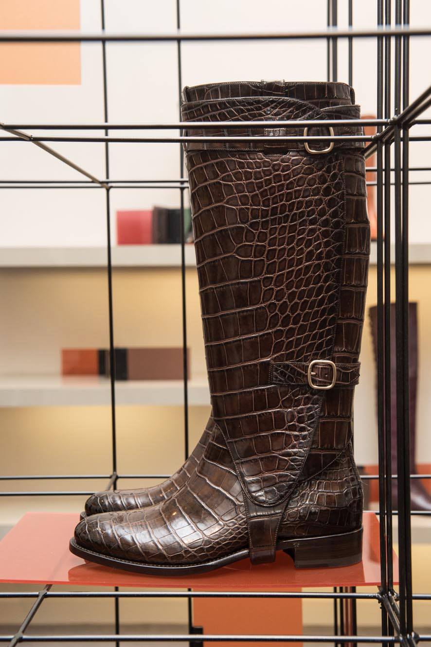 Conosciuti in tutto il mondo per un concetto di scarpa artigianale e senza tempo, Santoni ha allestito presso il suo elegante show-room di Via Montenapoleone n9 tre sale dal design contemporaneo impreziosite da strutture in metallo dove le calzature donna F/w 2015-2016 sono state sapientemente svelate attraverso tre linee stilistiche principali: la prima, ha portato alla nascita della collezione in collaborazione con la maison di tessuti Rubelli, composta soprattutto da scarpe e stivali damascati e broccati dall’allure Zarina e decadente, la seconda, ispirata ai mitici anni 70, caratterizzata invece da stivali dal tacco a cono in pelle liscia ingentiliti da riporti e applicazioni in coccodrillo tono su tono, da calzature preziose in cavallino maculato e decolletè in pelle bordeaux e nero decorate da applicazioni metalliche perfette per un donna contemporanea e metropolitana. La terza è stata la linea ispirata alle mete invernali più esclusive, composta da boots in volpe e coccodrillo,magnifiche decoltèe e sandali dall’ampio tacco in alligatore con fascia in visone dal grande impatto e dal concept indubbiamente luxury.