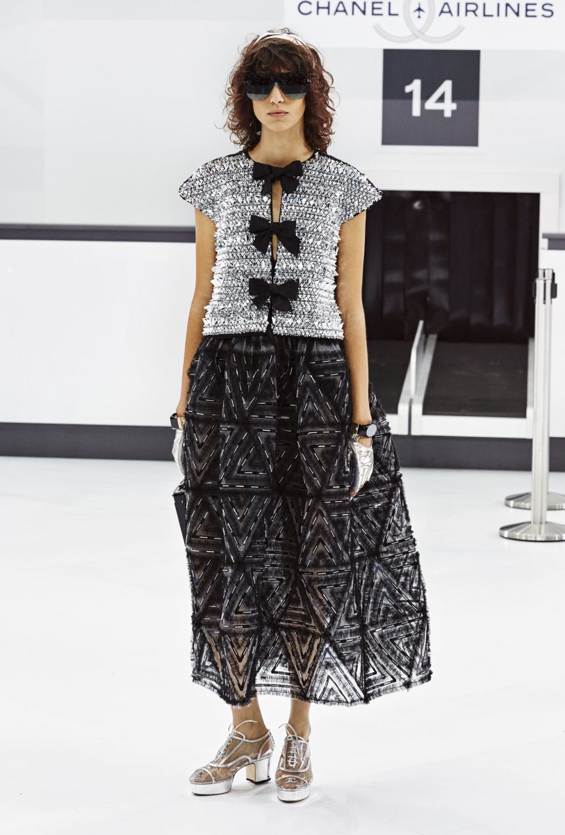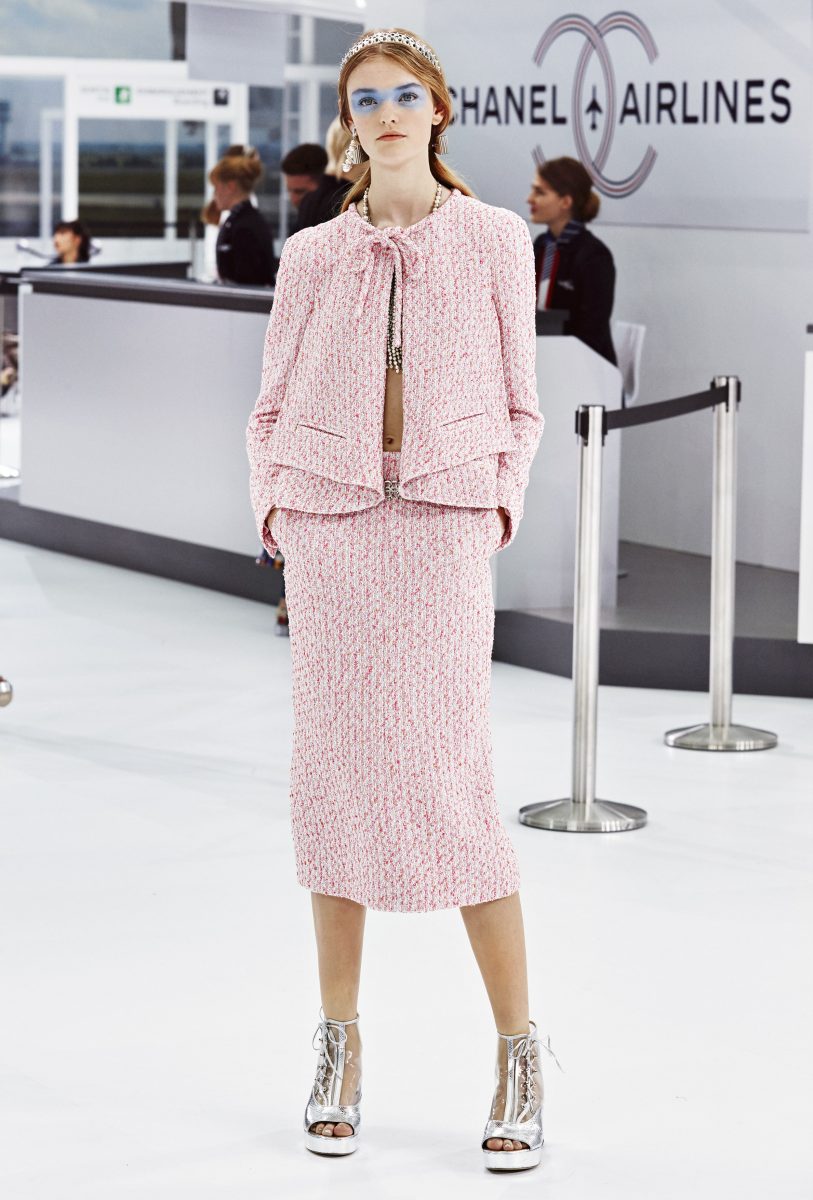Chanel invece, nel suggestivo scenario del Grand Palais, allestito per l’occasione come il più chic degli aeroporti, non smentisce la sua linea classica improntata ai tailleur colorati ed agli abiti foulard dalle varie lunghezze e dai toni che vanno dal bianco al celeste al rosa e al nero, ma anche ai vistosi maxi pantaloni da indossare sotto ampie gonne e che, per mano del direttore creativo Karl Lagerfeld, dà vita ad un nuovo concetto di lusso in cui si fondono gli stilemi della moda contemporanea con le culture sociali.