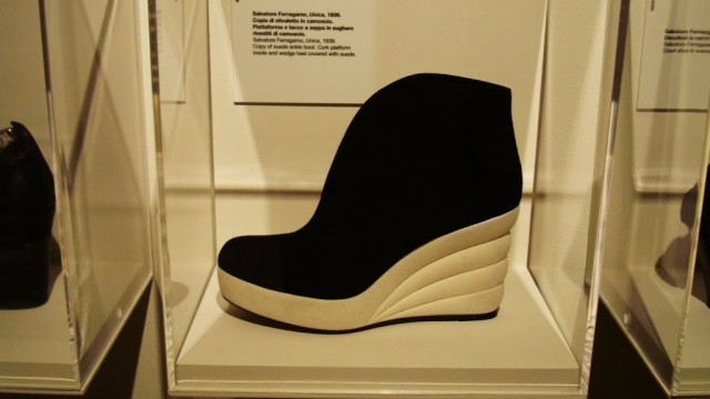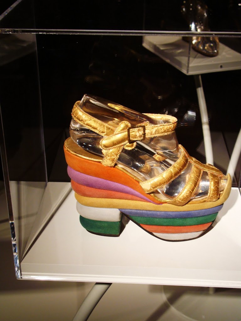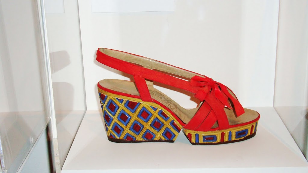 Salvatore Ferragamo-sandalo” Rainbow” con zeppa multicolore,relizzato per Judy Garland dopo il successo del mago di Oz.Con questa calzatura,per la prima volta la stampa dedicò attenzione all’argomento scarpe. |
