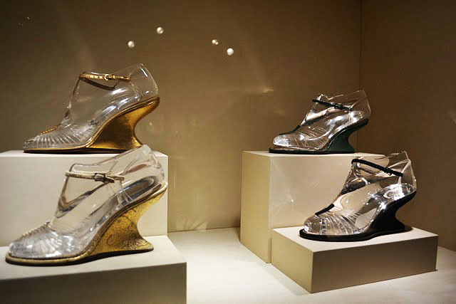 Salvatore Ferragamo-Sandalo” invisibile” la tomaia è formata esclusivamente da fili di nylon.1947(brevettata) |