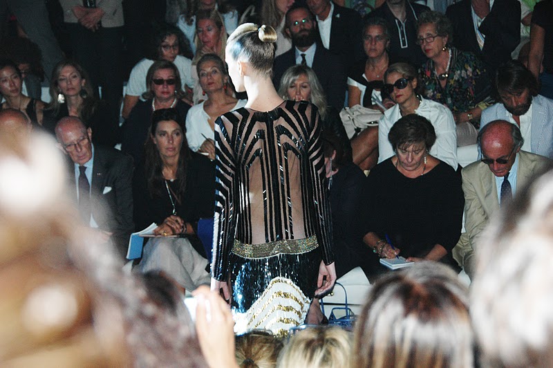 I pezzi che preferisco sono stati sicuramente gli abiti da sera, in organza lucida ricoperti quasi per intero di ricami raffinatissimi nelle tonalità calde dell’oro. Preziose poi le giacche giorno in fili di seta dorati,le lunghe camicie e i sinuosi abiti cocktail in seta dai colori verde smeraldo e nero.