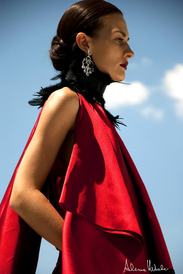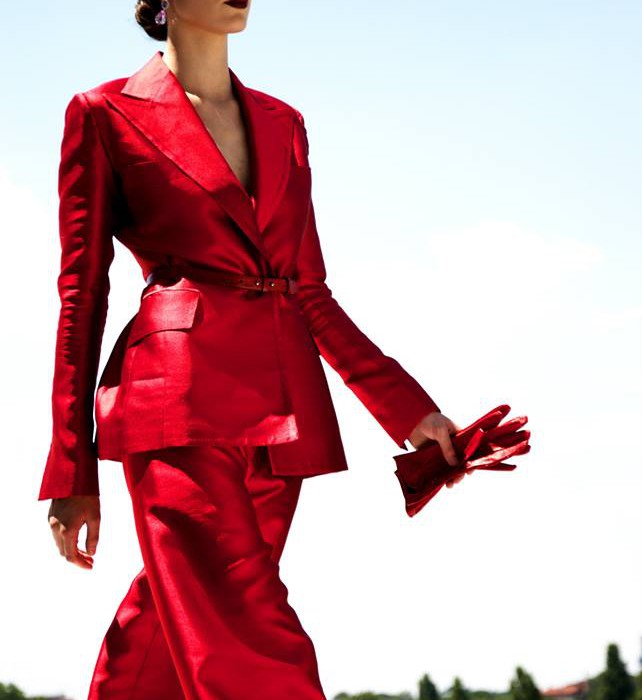Una collezione elegantissima, composta da strutturati pantaloni palazzo in pregiato cashmere, perfetti tailleur rivisitati senza maniche e stringati in vita, pizzo per cocktail dress e mikado di seta rosso fuoco.