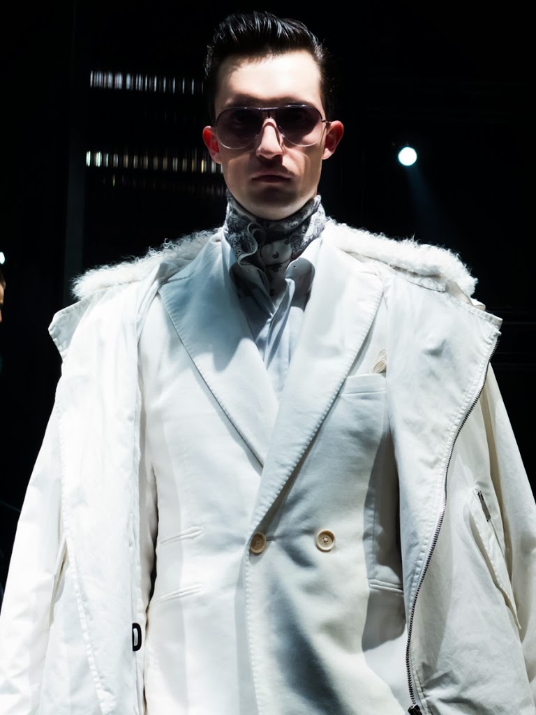 L’ispirazione di questa collezione arriva dallo stile del “Dandy Inglese“, reinventato attraverso i canoni tradizionali di Hogan. Non ho ben compreso a dire il vero il mix tra eleganti giacche sartoriali a doppio petto e confortevoli felpe da giorno in seta con logo in evidenza; a mio avviso insieme distraevano il pubblico.