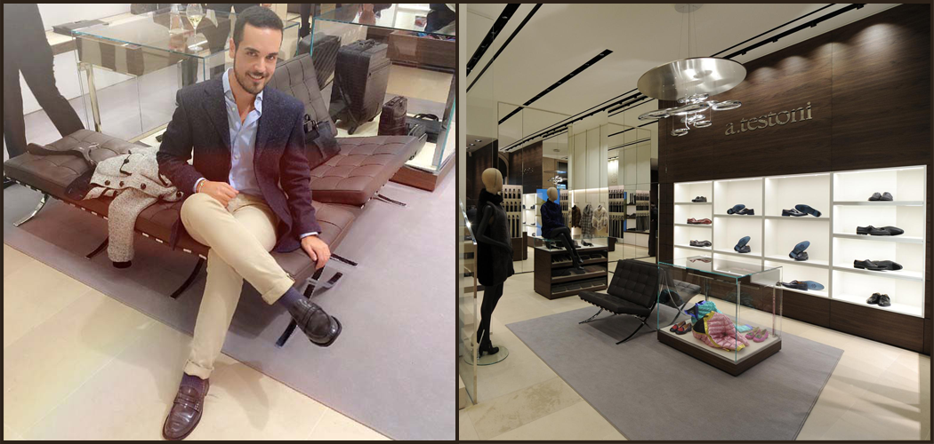 A. Testoni it’s a brand of Italian shoes ,100% made in Italy, that has restored one of the major stores in Italy for the image of its brand, offering to its products a showcase even more interesting, where the game of crystals and mirrors is mixed with dark wood walls completed with design harmchairs in dark brown colors.